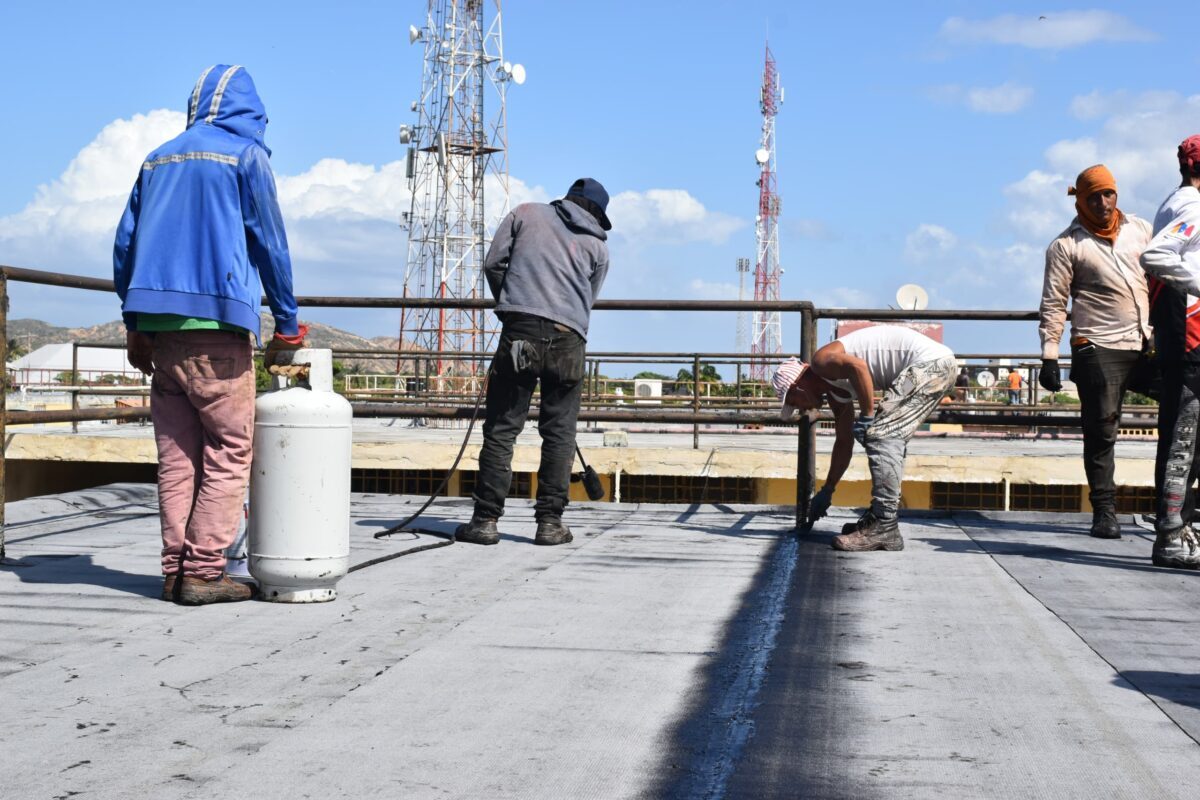 Cumaná, 5 de diciembre de 2024. — El Ministerio del Poder Popular de Obras Públicas (MPPOP), en articulación con el Gobierno Bolivariano, continúa ejecutando el Plan Techo Comunal en el estado Sucre, beneficiando en esta primera fase a 376 familias del urbanismo Villa Olímpica de Cumaná, mediante la impermeabilización de los techos de 26 edificios.